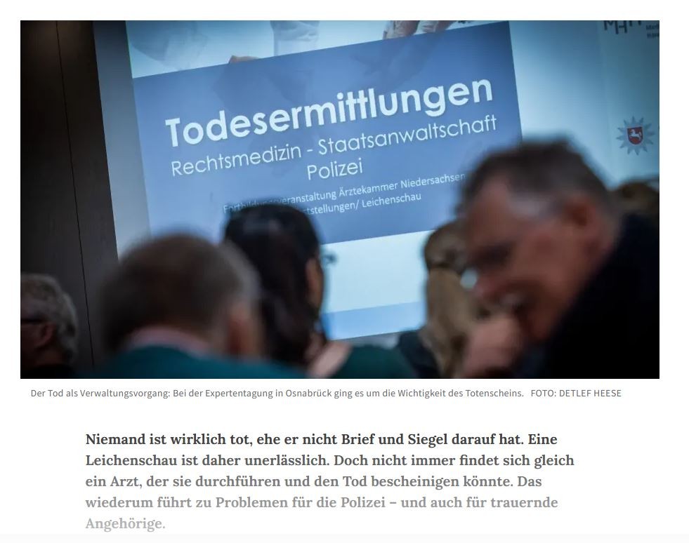 Am 17. April 2023 fand in Osnabrück unsere interdisziplinäre Fachveranstaltung der Ärztekammer Niedersachsen unter dem Titel „Nichts geht ohne Totenschein – Was tun, wenn da eine Leiche liegt?“ statt. Ziel der Veranstaltung war es, Ärztinnen und Ärzte sowie Ermittlungsbehörden für die Herausforderungen und rechtlichen Anforderungen bei der Durchführung der Leichenschau und der Ausstellung der Todesbescheinigung zu sensibilisieren.